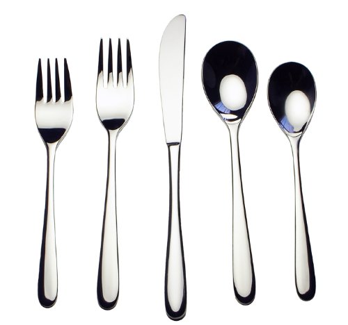 David Shaw 45 piece sleek mirror finish 18/10 stainless steel flatware set ,service for 8 with 5 serving pieces. Includes 8 dinner knife,dinner fork, salad fork, soup spoon, teaspoon, 1 serve fork, slotted spoon, serve spoon, sugar spoon, butter knife Corrosion resistant 18/10 stainless steel Dishwasher safe or hand wash with hot soapy water Limited life time warranty Never needs polishing